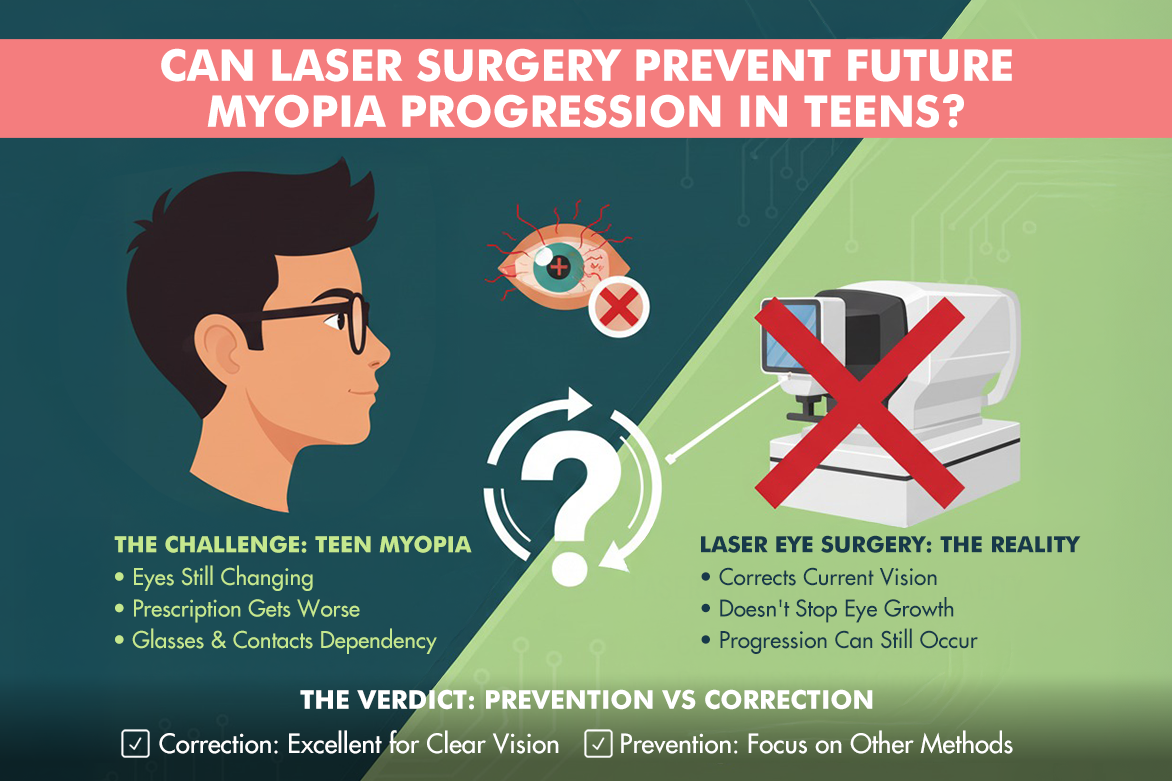 Laser vision correction has transformed the lives of millions by offering freedom from spectacles and contact lenses. However, while these procedures are highly effective in correcting existing myopia, the current clinical consensus is clear: they do not prevent ongoing myopia progression in teenagers. For long-term protection of adolescent vision, evidence-based strategies such as low-dose atropine, ortho-k lenses, and lifestyle modifications remain the interventions of choice. Families are encouraged to seek periodic eye health evaluations for teens.