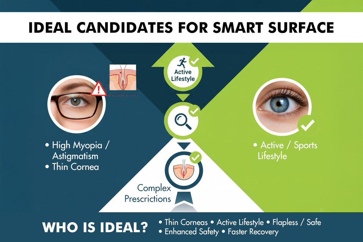 A good candidate for SmartSurf is someone who is over 18, has stable vision, and does not have severe dry eye or corneal disease.